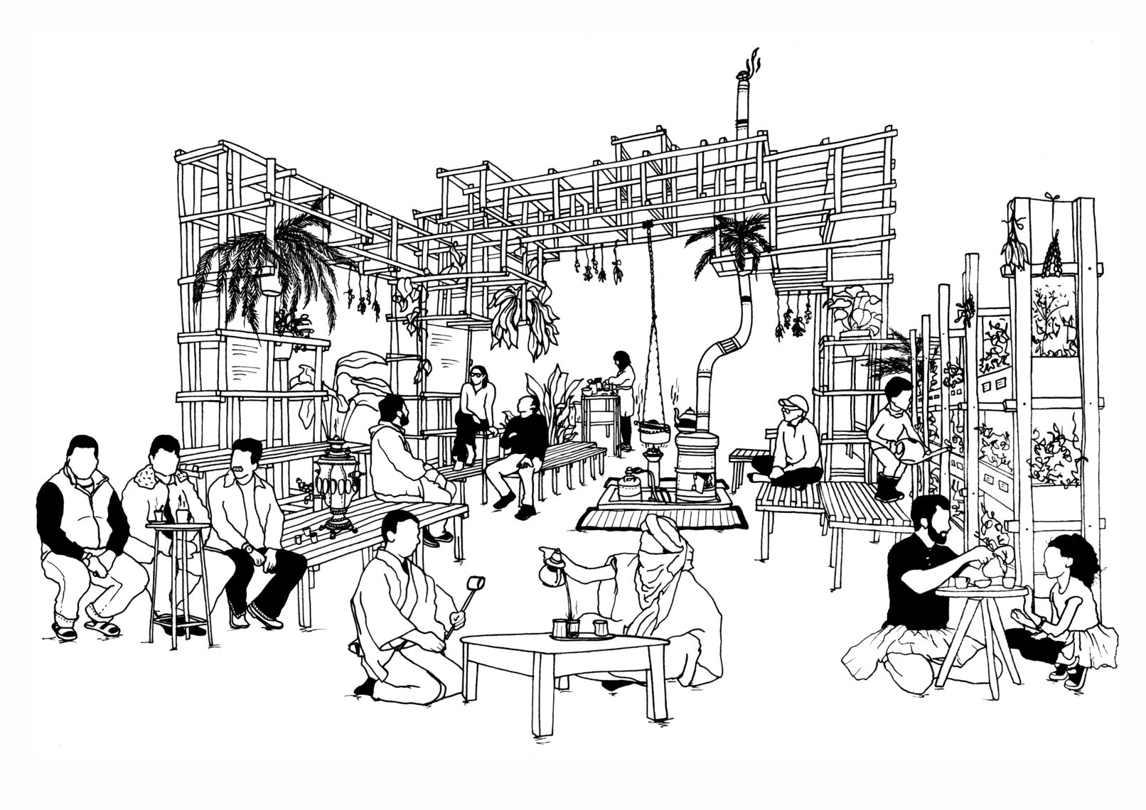 Das Teehaus lädt Besucher:innen ein, verschiedene Teekulturen kennenzulernen, eigene Zubereitungen auszuprobieren und Momente der Ruhe oder des geselligen Miteinanders zu genießen. Innerhalb der Strukturen können unterschiedliche Tees und Kräuter getestet und eigene Erfahrungen geteilt werden.