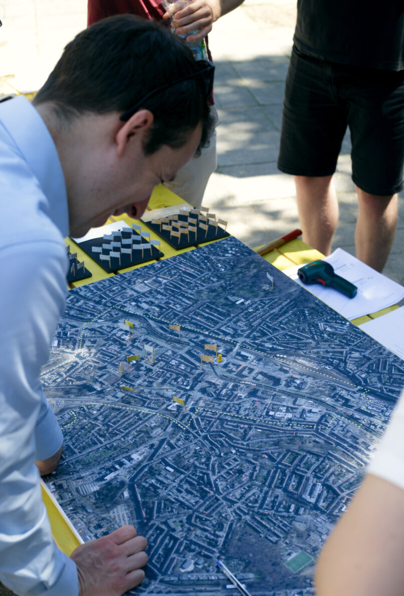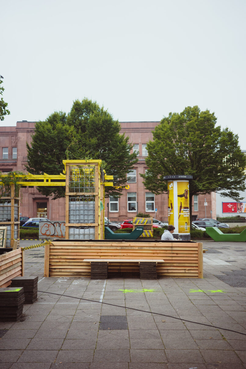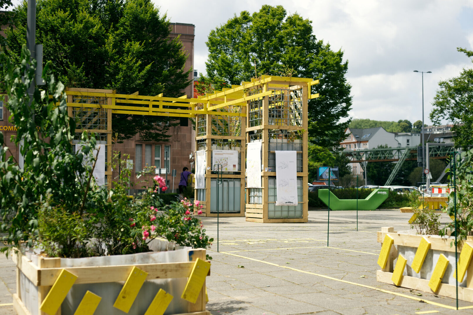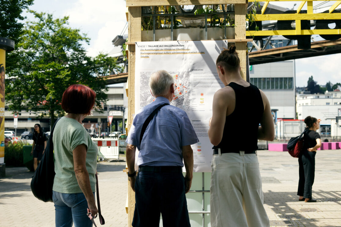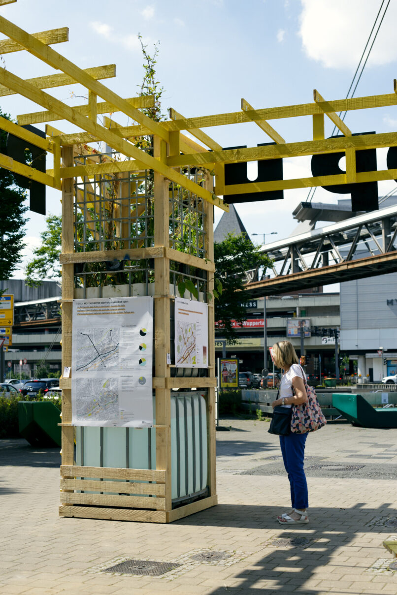 Die Stadt Wuppertal ist im bundesweiten Vergleich besonders von den Folgen des Klimawandels betroffen. Grund dafür ist die ausgeprägte Tallage sowie der hohe Anteil an versiegelten Flächen in der Talsole. Starkregenereignisse führen zunehmend zu teils verheerenden Überschwemmungen und die Überhitzung der innerstädtischen Lagen in den Sommermonaten nimmt stetig zu. Um die Bürger:innen Barmens für die Thematik zu sensibilisieren und gemeinsam Lösungsansätze zu entwickeln, die sich gleichzeitig positiv auf die Aufenthaltsqualität des rar gesäten öffentlichen Raums auswirken, wurde ein Forschungsprojekt zwischen dem Ressort für Stadtentwicklung und Städtebau der Stadt Wuppertal, der TH Köln (Fakultät für Architektur) und Studio Quack initiiert. Der Schwebebahnhaltestellenvorplatz Alter Markt, exemplarisch für den Barmer Stadtraum, in unmittelbarer Nähe zum Stadtzentrum dient als kooperatives Experimentierfeld im Sinne eines Reallabors. Zu Beginn wurde eine erste installative Bespielung des Platzes von Studio Quack durchgeführt; in Form eines multifunktionalen Rankgerüsts diente dieses zur Ankündigung des geplanten Projekts, wie auch als Ausgangspunkt für die anstehenden Projektschritte. Studierende der TH Köln, Fakultät für Architektur, haben daraufhin inhaltliche Recherche zur Erstellung einer Datengrundlagenermittlung betrieben sowie eigene Analysen und verschiedenartiger Umfragen erhoben. Deren Ergebnisse floßen in eine temporäre Platzgestaltung. Geplant und koordieniert von Studio Quack, umgesetzt zusammen mit Studierenden der TH Köln und interessierten Bürger:innen soll erprobt werden, wie die räumliche Transformation seitens der Bürger:innen tatsächlich angenommen wird, wie sich diese auf die Nutzung des Raumes auswirkt und inwieweit die Bepflanzung den örtlichen Gegebenheiten angemessen sind bzw. die intendierte Umgestaltung unterstützt. Ein durchgängiges Monitoring wertet fortlaufend Daten und Meinungen aus. Nach der Sanierung der benachbarten Schwebebahnhaltestelle soll der Park letztlich in eine den Bedürfnissen der Nutzer:innen angemessene sowie den klimatischen Veränderungen entsprechende dauerhafte Gestaltung überführt werden.
