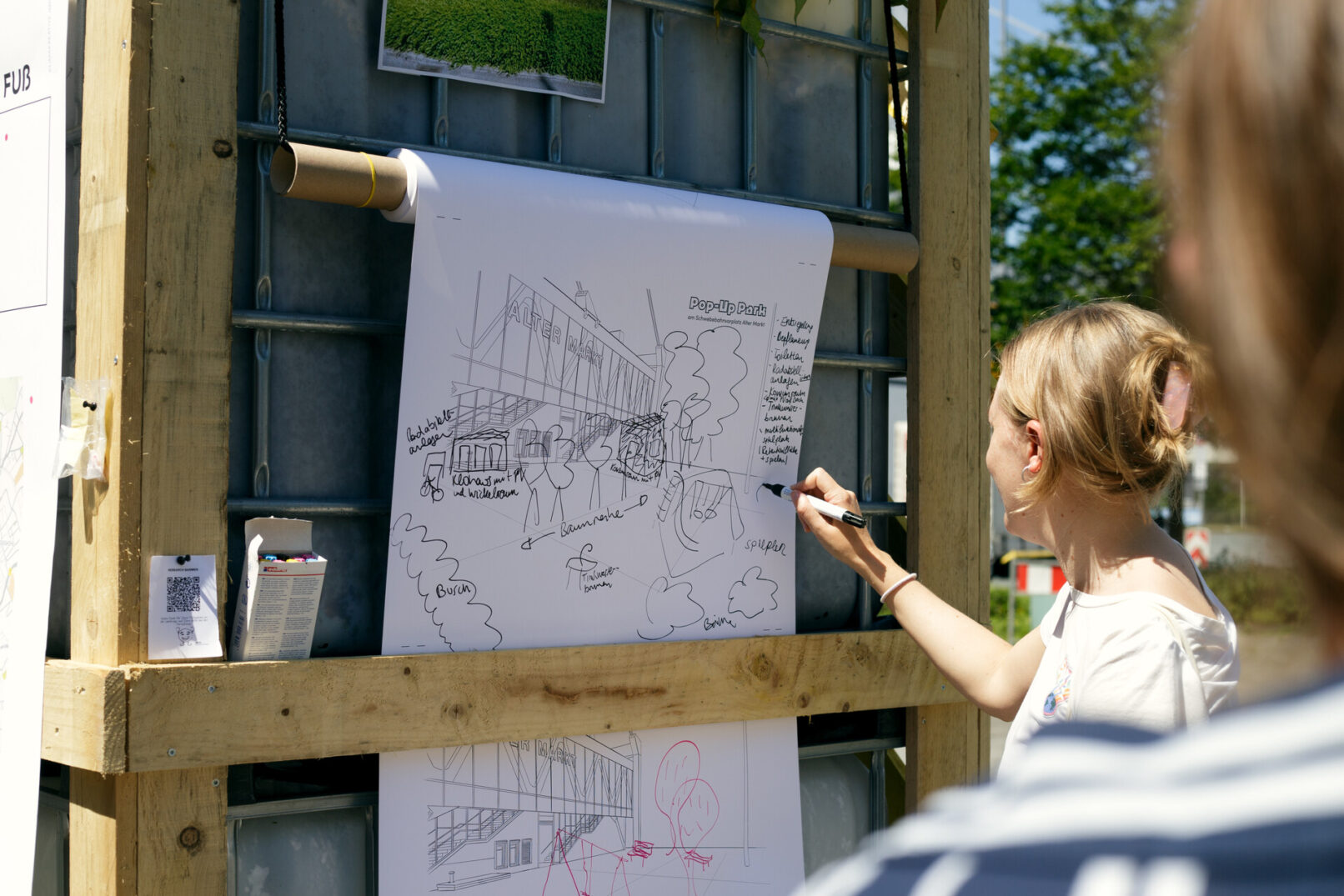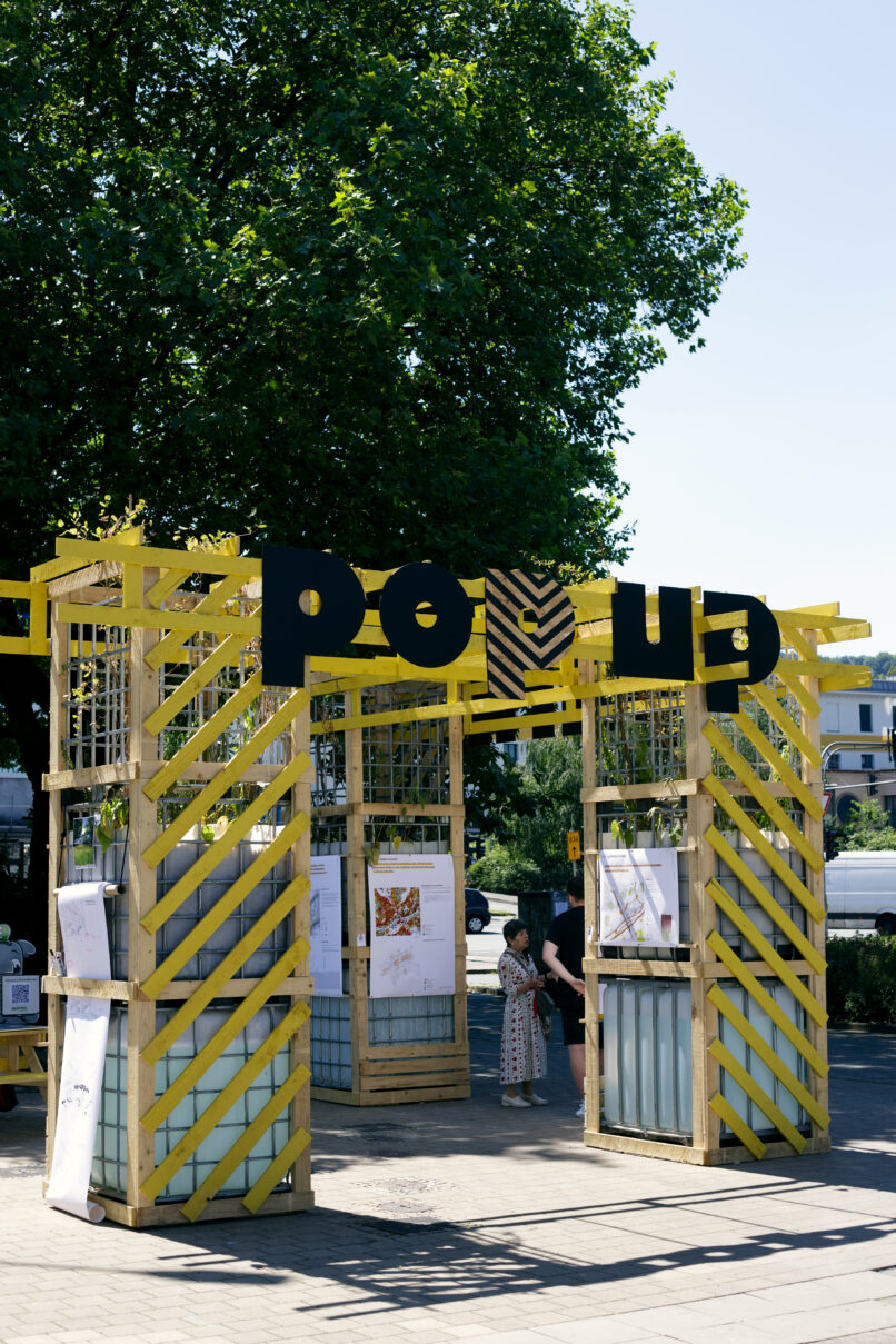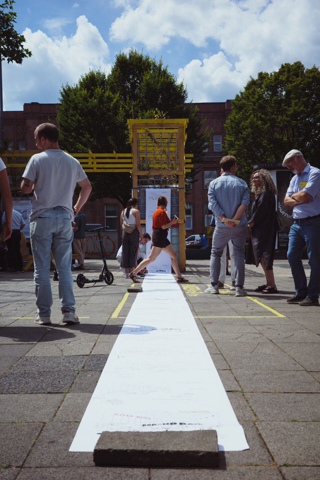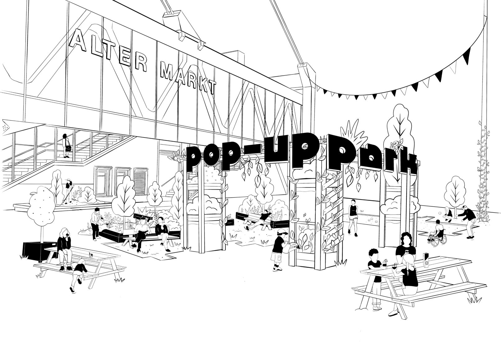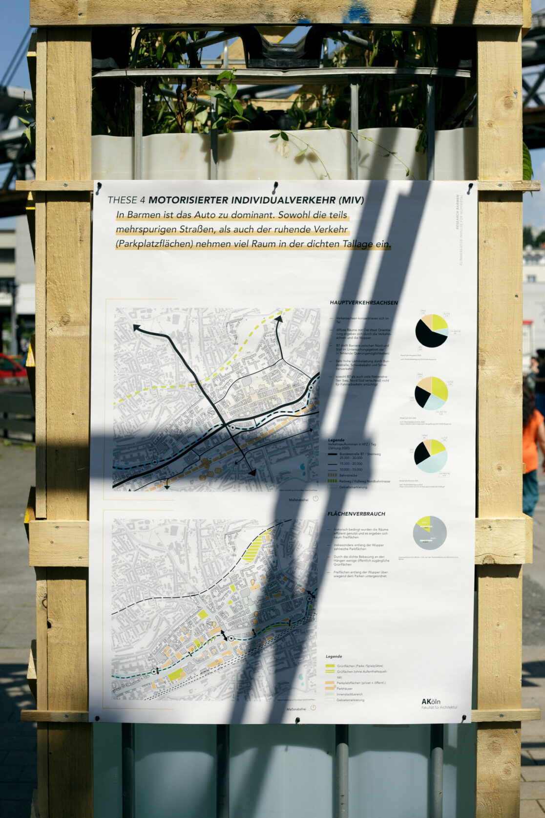 Die Stadt Wuppertal ist im bundesweiten Vergleich besonders von den Folgen des Klimawandels betroffen. Grund dafür ist die ausgeprägte Tallage sowie der hohe Anteil an versiegelten Flächen in der Talsole. Starkregenereignisse führen zunehmend zu teils verheerenden Überschwemmungen und die Überhitzung der innerstädtischen Lagen in den Sommermonaten nimmt stetig zu. Um die Bürger:innen Barmens für die Thematik zu sensibilisieren und gemeinsam Lösungsansätze zu entwickeln, die sich gleichzeitig positiv auf die Aufenthaltsqualität des rar gesäten öffentlichen Raums auswirken, wurde ein Forschungsprojekt zwischen dem Ressort für Stadtentwicklung und Städtebau der Stadt Wuppertal, der TH Köln (Fakultät für Architektur) und Studio Quack initiiert. Der Schwebebahnhaltestellenvorplatz Alter Markt, exemplarisch für den Barmer Stadtraum, in unmittelbarer Nähe zum Stadtzentrum dient als kooperatives Experimentierfeld im Sinne eines Reallabors. Zu Beginn wurde eine erste installative Bespielung des Platzes von Studio Quack durchgeführt; in Form eines multifunktionalen Rankgerüsts diente dieses zur Ankündigung des geplanten Projekts, wie auch als Ausgangspunkt für die anstehenden Projektschritte. Studierende der TH Köln, Fakultät für Architektur, haben daraufhin inhaltliche Recherche zur Erstellung einer Datengrundlagenermittlung betrieben sowie eigene Analysen und verschiedenartiger Umfragen erhoben. Deren Ergebnisse floßen in eine temporäre Platzgestaltung. Geplant und koordieniert von Studio Quack, umgesetzt zusammen mit Studierenden der TH Köln und interessierten Bürger:innen soll erprobt werden, wie die räumliche Transformation seitens der Bürger:innen tatsächlich angenommen wird, wie sich diese auf die Nutzung des Raumes auswirkt und inwieweit die Bepflanzung den örtlichen Gegebenheiten angemessen sind bzw. die intendierte Umgestaltung unterstützt. Ein durchgängiges Monitoring wertet fortlaufend Daten und Meinungen aus. Nach der Sanierung der benachbarten Schwebebahnhaltestelle soll der Park letztlich in eine den Bedürfnissen der Nutzer:innen angemessene sowie den klimatischen Veränderungen entsprechende dauerhafte Gestaltung überführt werden.